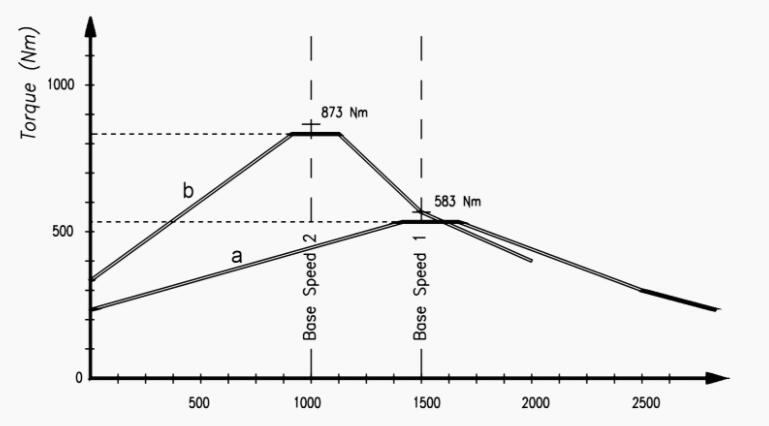 對于恒定轉矩負載,當電動機在最大速度的弱磁范圍內運行良好時,可獲得較大的速度范圍。這意味著最有效地利用了變速驅動器的扭矩/速度功能。