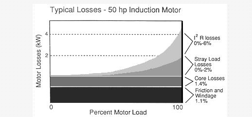 摩擦和磁化損耗與電動機負載無關,并且僅與電動機的尺寸和設計有關。剩余的損耗稱為雜散負載損耗。嚴重欠載的電動機效率較低,因為摩擦,風阻和鐵心損耗保持恒定,并且占電動機總功耗的百分比越來越大。下圖顯示了隨電動機負載變化的電動機損耗的各個組成部分。